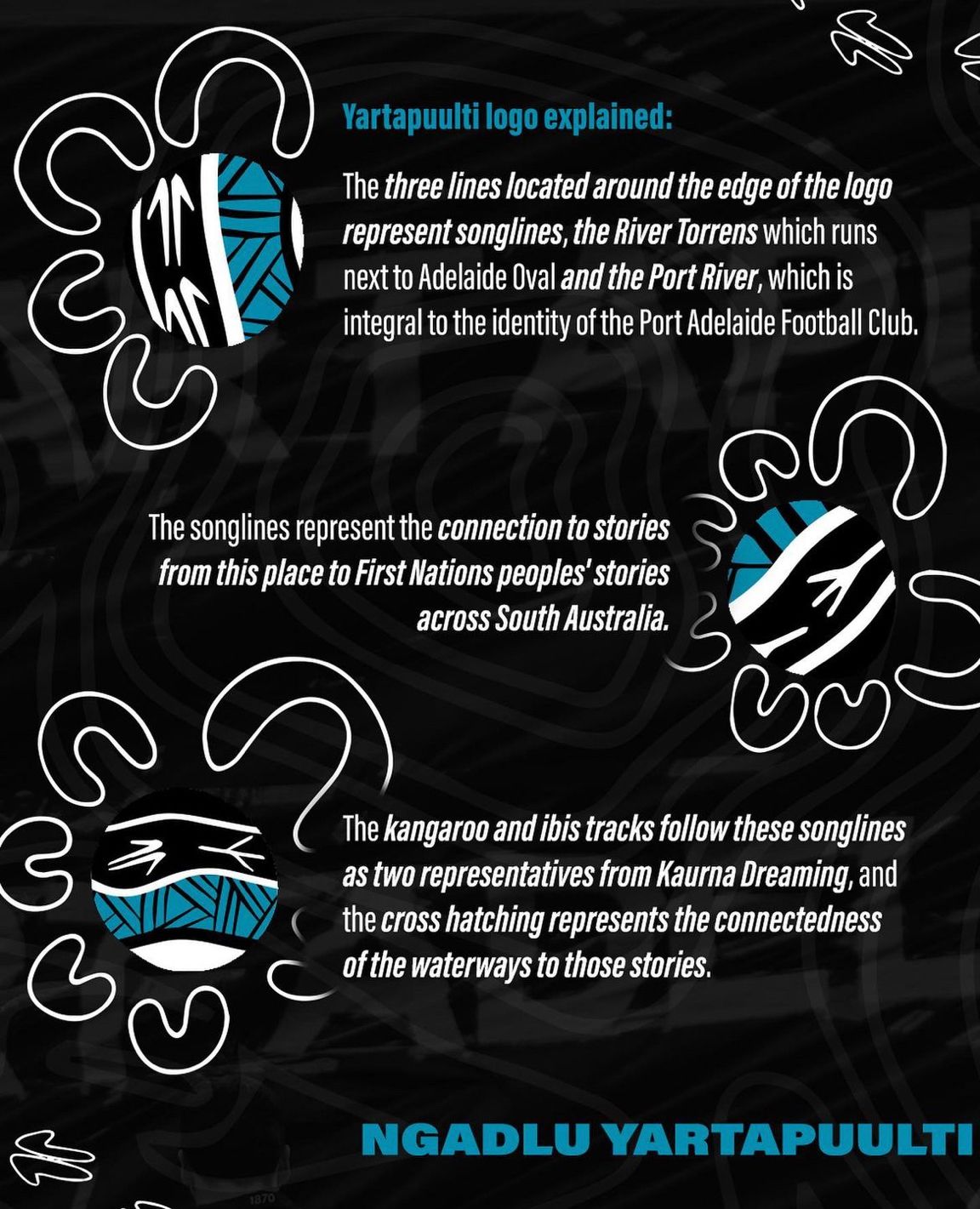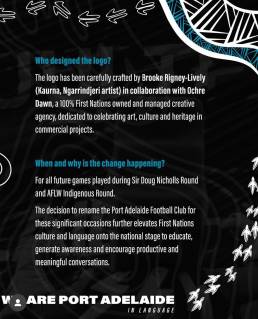 The Ochre Dawn team is proud and grateful beyond words to have worked with Yartapuulti Football Club (Port Adelaide FC) and Kaurna, Ngarrindjeri artist Brooke Rigney-Lively on this significant project – designing the club’s new logo to be used for games played during Sir Doug Nicholls Round, AFLW Indigenous Round and SANFL First Nations Round.