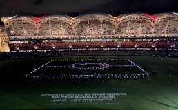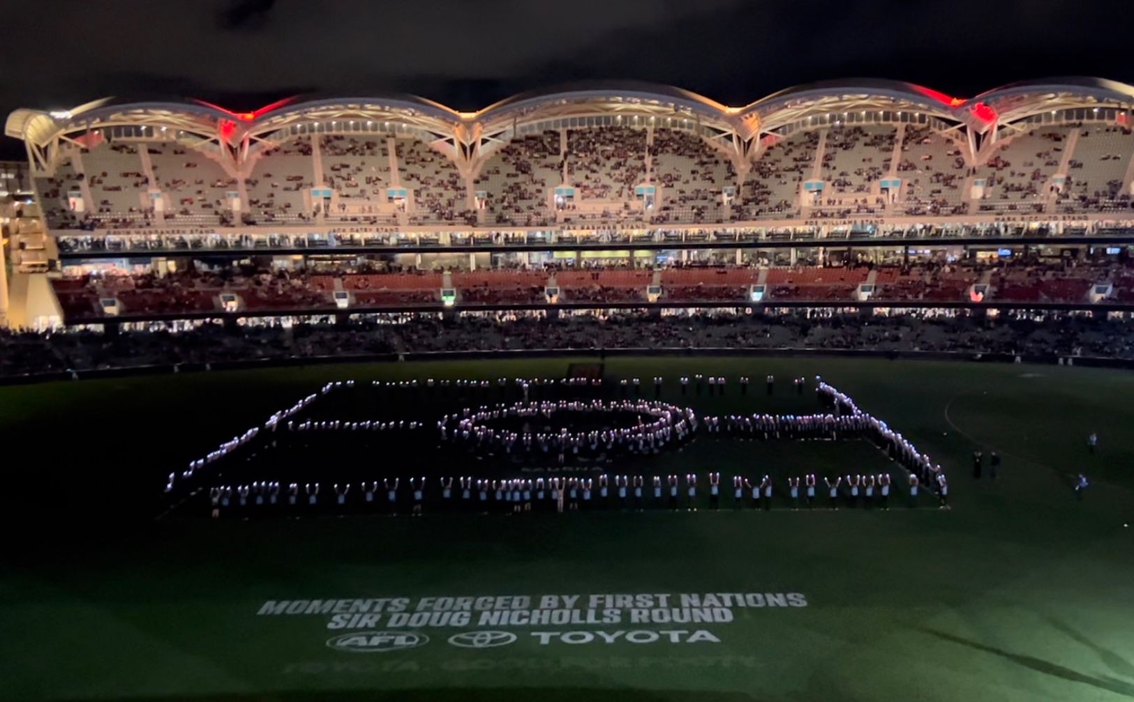 Prior to the game, the Oval was powered up by a special dance performance from more than 500 participants of the Aboriginal Power Cup program. The crowd erupted with cheers when the overhead lights were switched off to reveal the students standing in an illuminated formation of the Aboriginal flag in the centre of the Oval.